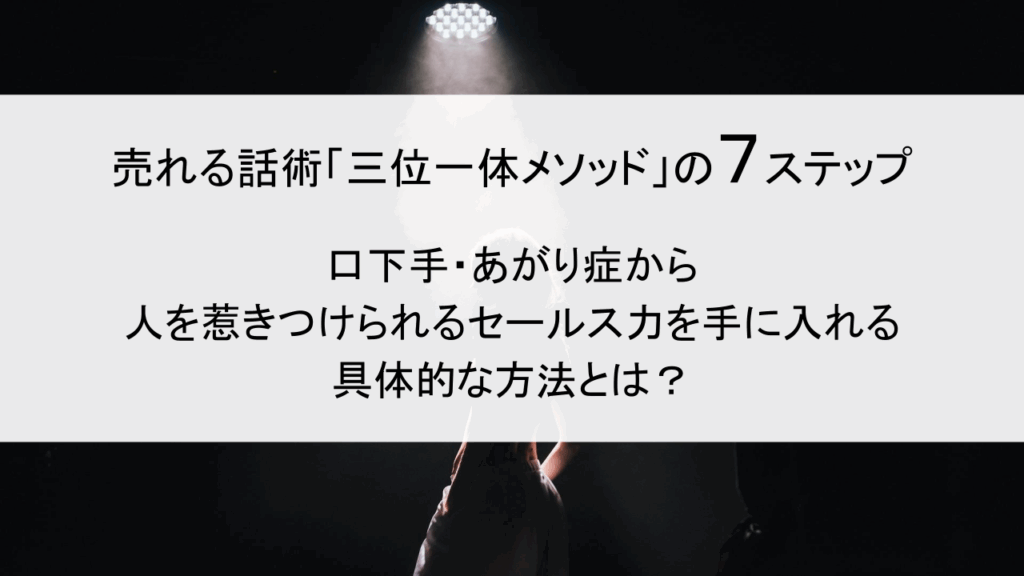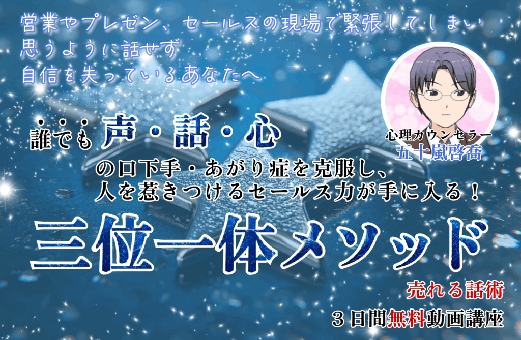 自分自身の過去の経験から、口下手・あがり症からセールス上手になれる三位一体メソッドを考案しました。